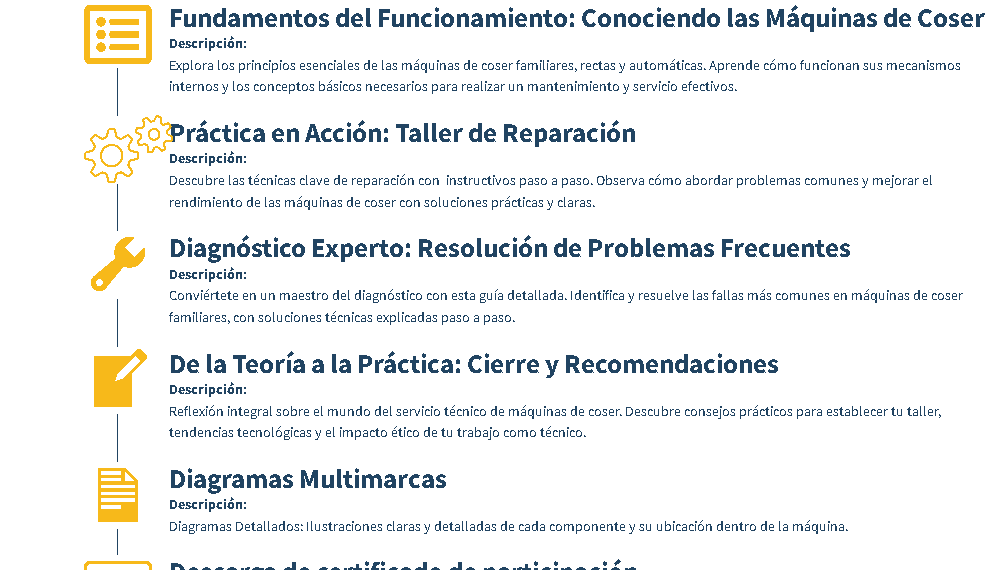 Aprenderás paso a paso cómo solucionar los problemas más comunes que afectan a estas máquinas, desde su mantenimiento básico hasta realizar reparaciones. Además, descubrirás cómo identificar fallas, ajustar piezas, limpiar mecanismos y dejar tu máquina funcionando como nueva.